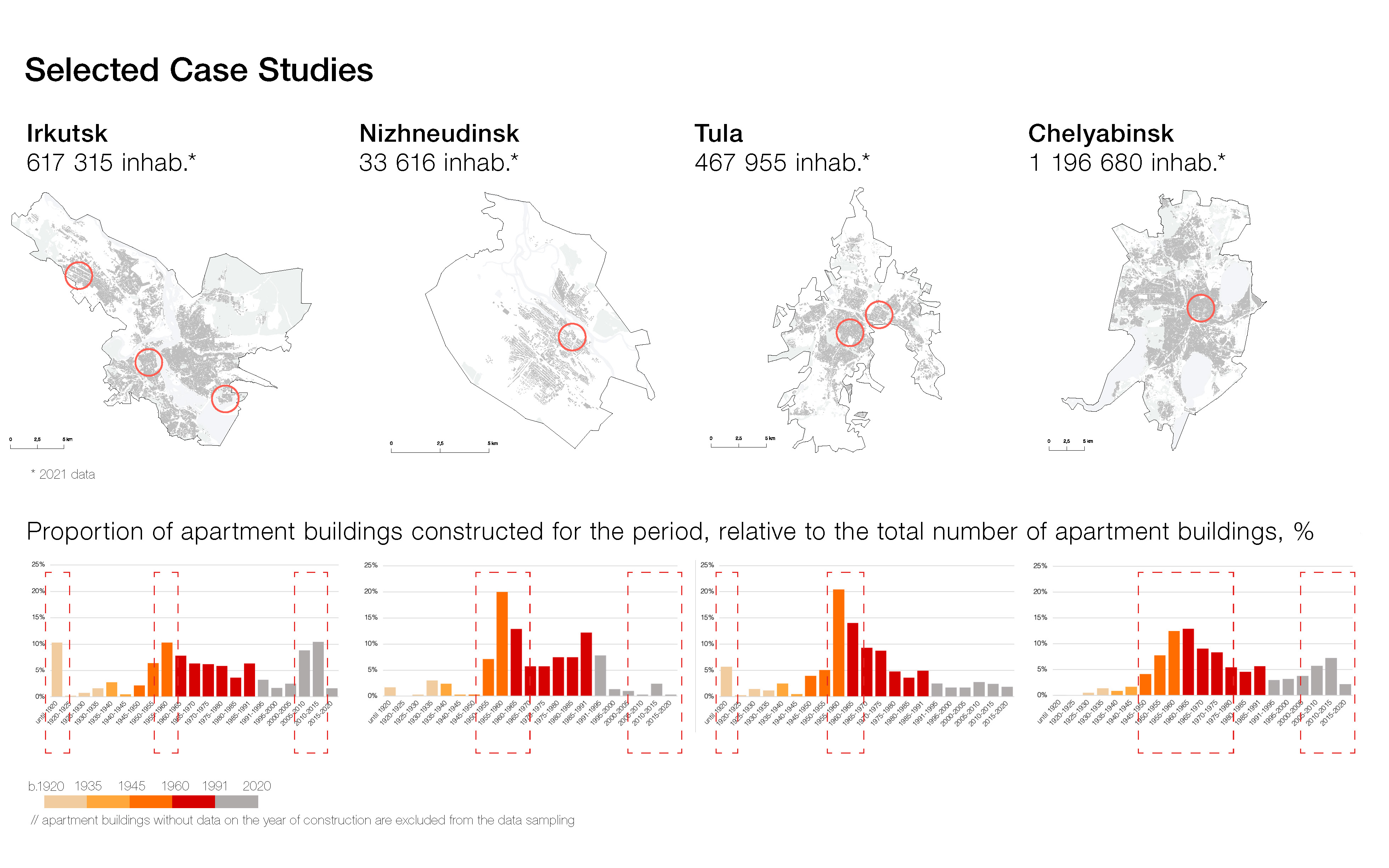Investigation and evaluation of representative spatial transformation processes in selected residential neighbourhoods of the late 19th and 20th centuries in Nizneudinsk, Irkutsk, Tula and Chelyabinsk.